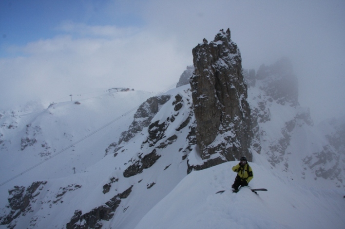 Если с подъемника подняться чуть по гребню, то от этой скалы можно начать спуск с самого верха катаемого кулуара.
