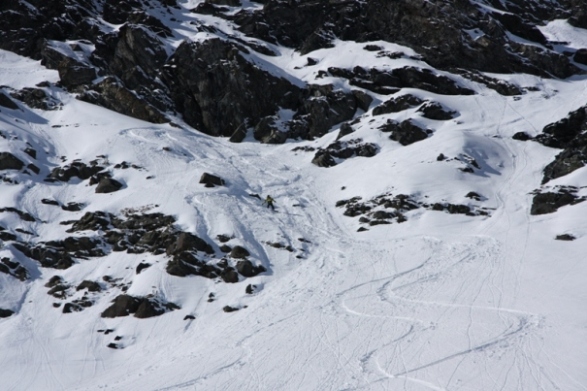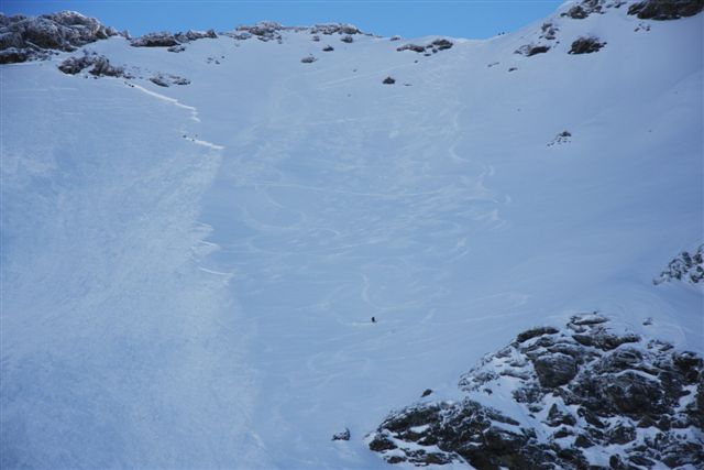 Во время первого подъема пронаблюдали, как спасы грохнули в нем лавинку (внизу виден вынос). Снега много не спустили, зато серединку очистили до жести.