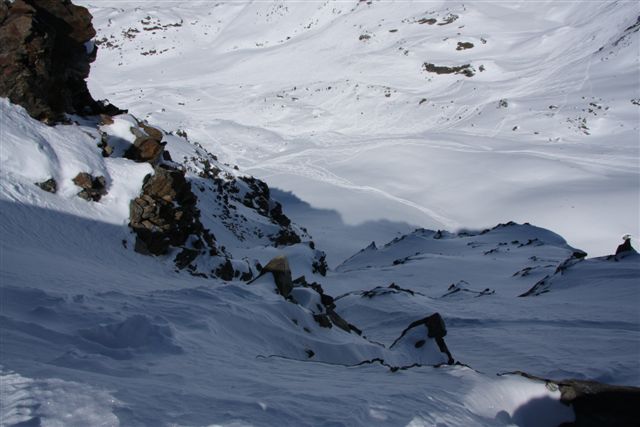 При спуске с верхней первой ступени склонов перед кулуаром - "яма-котловина", попав в которую остается только вариант спуска вниз прямо по нему (или подъем пешком в обход).