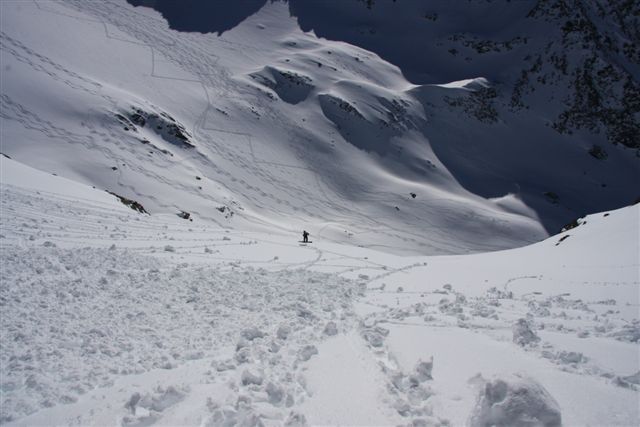 Двойка сразу переехала на склон, очищенный лавиной (он чуть темнее на фото) и продолжила движение по снежным комкам.