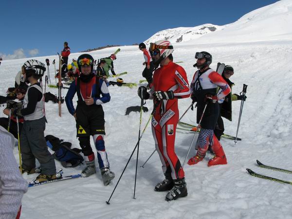 По мере приближения старта раскисание идет прямо в геометрической прогрессии. Еду! Трасса, некрутая с виду, разгоняет будь здоров. В ямах-то стынет добрый ледок – мы на Эльбрусе! В середине, где-то метров с трехсот, выраженный спад. Прет прямо нормально. Канавы, как и ожидалось, набиты поперек хода, с запозданием, и чтобы не пахать отработку глубиной по... кинжал, приходится идти все «по низам». Длинные скользкие лыжи тут были бы как нельзя кстати, будь они живы… Короткие подубитыне «треники» Леши Макарова, увы, едут никак. Трасса просторная, размашистая, можно бы ввалить и по канавам даже, но не на этом…
