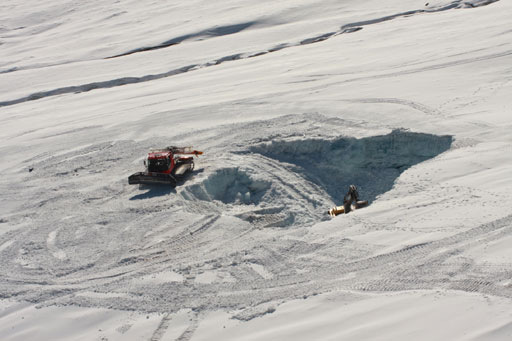 Сноубордистов еще нет. Тормозят, как обычно, на самом интересном месте. Склоны готовят к октябрьскому этапу Кубка мира по горным лыжам. Заливают свежий асфальт и дырки в глетчере.