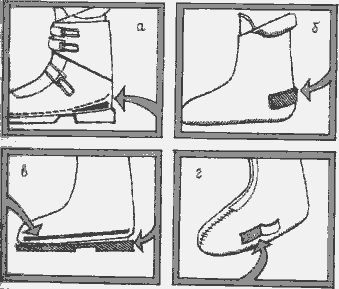 Если при сгибании голеностопа пятка приподнимается, необходимо подогнать ботинки по ноге (см. рис.). Для этого можно подложить под заднюю часть внутреннего ботинка клиновидную подкладку (а) или снаружи на внутренний ботинок ниже косточек лодыжек наклеить с двух сторон поролоновые подушечки (б). Если ботинки сильно давят на подъем, то следует удалить стельку из внутреннего ботинка (в). Если этого недостаточно уменьшите толщину стельки, расположенной под внутренним ботинком. Слишком узкие ботинки будут сдавливать стопу с боков, чаще всего у основания большого пальца. В этом случае удалите часть пористого наполнителя из внутреннего ботинка в болевой точке (г). Эффективен следующий способ. С внутренней стороны наружного ботинка приложите горящую электрическую лампочку мощностью 100 Вт и держите ее до тех пор, пока не начнется размягчение полиуретана (примерно 10 мин). Затем поперек ботинка вставьте деревянную распорку (одним концом упирающуюся в размягченное место) и затяните нижние пряжки. Дайте ботинку остыть.