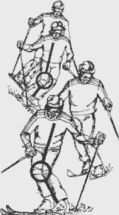 Чтобы выполнить серию согласованных поворотов следует каждый из них начинать агрессивно. Научить. этому можно, поднимаясь по лестнице (см. рис.). Встаньте боком к лестнице, поставьте ногу на верхнюю ступеньку и заставьте мышцы этой ноги втянуть вас наверх. Хорошенько запомните это ощущение — оно очень напоминает ощущение, которое возникает у вас при выпрямлении горной ноги при входе в поворот. Итак, начинайте поворот с агрессивного толчка верхней рулящей ногой (за счет мышц бедра) и увеличивайте ее сгибание в конце поворота. Это упражнение позволяет сосредоточить внимание на горной ноге, чтобы она раньше включалась в работу.