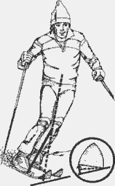 Для того чтобы кант перестал работать, он должен быть освобожден от сцепления со снегом посредством плоской постановки лыжи. Для этого необходимо перейти от ангуляции (см. рис., контурная фигура) к отвесной стойке. В результате такого перехода лыжи окажутся под горнолыжником, и у него начнется боковое проскальзывание. Помните, что плоско поставленная лыжа в действительности не располагается на снегу совершенно плоско, иначе вы бы обязательно зацепились внешним кантом при попытке бокового проскальзывания и упали.