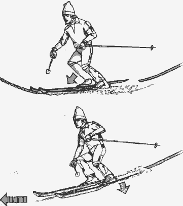 Если лыжа раскантована, то в зависимости от точки приложения веса тела какая-то часть лыжи будет проскальзывать быстрее (см. рис.). Так, при перенесении веса тела вперед (левый рисунок) носки лыж начнут отклоняться в долину, проскальзывая быстрее, чем задники. При отклонении назад во время проскальзывания (правый рисунок) задники будут проскальзывать быстрее, уходя в долину. Таким образом, вы можете исполь-ювать боковое проскальзывание для исправления дуги поворота, перенося вес тела вперед или назад.