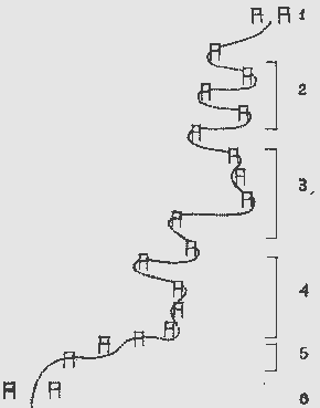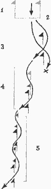 Ворота — это два древка одинакового цвета, поставленные в снег (см. рис.). Между ними проходит воображаемая линия (2), которую должны пересечь стопы. Существует два типа ворот. Если два древка поставлены перпендикулярно линии ската, они образуют «открытые» ворота (1), если же параллельно линии ската, — «закрытые» ворота (3). Закрытые ворота разрешается проходить с любой стороны, но всегда один из вариантов будет оптимальным. Часто на трассе ставят сочетания ворот. Так, двое закрытых ворот, поставленных на расстоянии около 1 м друг от друга, образуют «шпильку» (4). Трое или более закрытых ворот, поставленных приблизительно на одной линии, образуют «змейку» (5). Эти сочетания вам следует запомнить. Как вы будете проходить «шпильку» или «змейку», зависит от того, где поставлены следующие ворота. Если трасса хорошо поставлена, «шпильки» и «змейки» будут находиться на более пологих участках или на переходах от крутых участков к пологим. Любой хороший постановщик трасс начнет, по крайней мере, с трех легких ворот от старта, чтобы спортсмен установил необходимый ритм прохождения остальной части трассы. Трасса должна заканчиваться также тремя довольно простыми воротами, поставленными без резких поворотов.