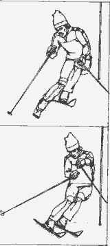 Горнолыжнику не хватает хорошей техники (средний рисунок). Здесь отсутствует четкое движение вверх-вниз во время поворота. В подготовительной фазе тело не сдавливается, поэтому трамплинный эффект, бросающий горнолыжника в следующий поворот, отсутствует. Это отсутствие динамичности является результатом слабой закантовки внешней лыжи, которая имеет тенденцию к сильному проскальзыванию при выполнении поворота вокруг метки. Он не смог повернуть точно у метки и поэтому широко обходит внутреннее древко.