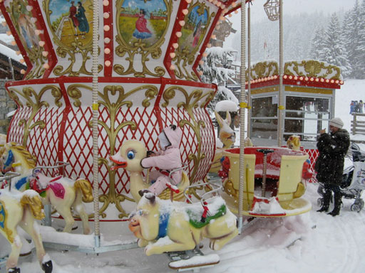 От нашей резиденции до подъемника Олимп – 10 минут ходу. Лыжи и ботинки можно оставлять при подъемнике (10 евро за неделю). В 8-30 шестиместные кабинки начинали перемещать горнолыжников наверх, и через 25 минут из весны: с травой, кустиками, сухим асфальтом и соловьями - мы попадали в зиму, в самый центр поселка Мерибель. По дороге делали две промежуточные остановки. В будни очередей не было, в воскресенье стояли минут пятнадцать.