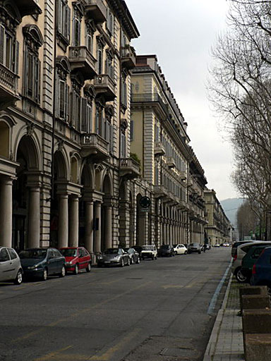 В Турине, как и везде, где мы были в Италии, каждое окно снабжено внешними ставнями. И если в старых домах ставни распашные, то в новых по современному прячутся где-то свернутыми наверху. Для малоэтажного строительства это выглядит гармонично, а вот во многоэтажных домах русскому глазу такое видеть непривычно. Дома подступают вплотную к улицам, тротуары – внутри в галерее, что высотой с первые два немаленьких этажа. Очень удобно как при жарком солнце, так и в дождливую погоду.