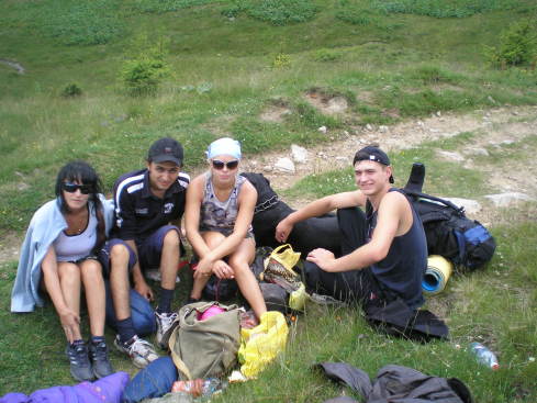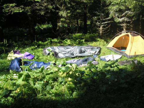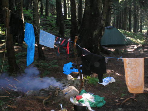Прибыв на место возле озера, разбили лагерь. Людей из-за трех выходных было очень много. Кто в такую погоду даже и не сунулся наверх, а ждал погоды, кто еще просто не успел, разбив подъем на два этапа, а кто, как мы, выбрал вариант после подъема спуститься вниз. Высушиться нам не удалось, шел дождик. Костер распалили под клеенкой и только успели пожарить сосиски. Так было холодно и сыро, что мы, взяв консервы, шоколад, сразу залезли в палатку, чтоб переодеться в сухое и согреться, ужинали в ней же. Ждали утра с надеждой, что утром дождя не будет. Так и случилось. Утром вышло солнышко, и мы получили возможность высушить наши вещи, позавтракать вкусной кашей на костре с ароматным чаем.