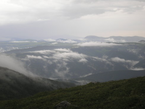 Спуск тоже был не легким. Хотя дождь был уже не сильным, гроза утихла и не было уже мыслей "если долбанет молния, то как меня потом (мое тело) назад спустят", идти было не легко, тропа розмыта водой и скользко. Но мы шли, пели песни и мечтали о палатке, тепле, костре, теплых носках и ужине!